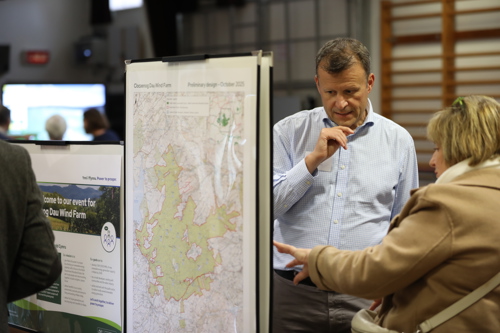 Yn y tri chyfarfod ymgynghori, roedd tîm Trydan wrth law i ateb cwestiynau, casglu barn ac egluro’r cynlluniau dechreuol ar gyfer y cynllun 22 tyrbin a gyhoeddwyd yn ystod yr haf.